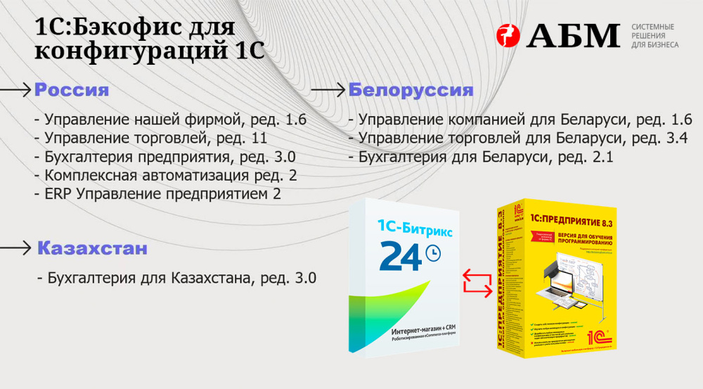 интернет-магазина , СПАРК риски. В этом тарифе доступен полный функционал модуля 1С:Бэкофис 2.0, в том числе синхронизация между 1С и Битрикс24: товарами, сделками, счетами, заказами и справочниками*.